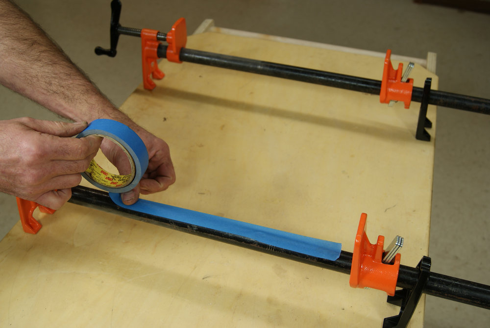Prep your clamps. If you’re using pipe clamps made up with black pipe, put masking tape on the pipe. If you don’t, glue squeeze out can loosen up the black coating and allow it to migrate into your panel. It can take A LOT of sanding or planing to remove those black marks.