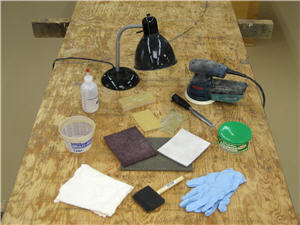 Application: Work light, foam brush, 12" x 12" lint-free rag, finishing gloves, squirt bottle, small plastic container.