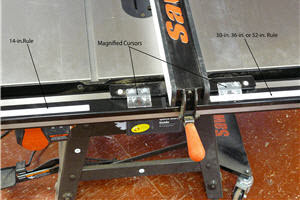 There are a few operations where you realize the SawStop is a different animal. Changing blades is one of those operations. The gap between the brake cartridge and the blade is very sensitive and because there are minute differences in the diameter of each blade some checking and fine-tuning of the brake cartridge may be necessary for safe operation. Fortunately, SawStop has made the task quick and easy thanks to the convenient, self-storing blade spacing gauge (Photo 4).