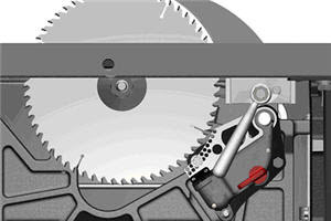 SawStop's safety system has done for the table saw what airbags did for the automobile; dramatically increase safety. SawStop's safety feature is basically a blade break on steroids. It sends a low voltage current through the blade that can sense contact with your skin. It works in much the same way as lamps that dim when you touch the metal stand. Once skin contact is made with the blade, the brake is activated stopping the spinning blade in .005 seconds. That's 10 times faster than the airbags in your car. The fast stop breaks a shear pin and the blade instantaneously drops below the table. The end result for the sawyer is a nick on the finger instead of a trip to the emergency room. For more info on the brake system, including a cool slo-mo video of the brake in action, visit www.sawstop.com.